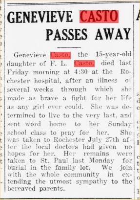There's a Genevieve E. Casto buried in Roselawn Cemetery, Ramsey County Minnesota dying August 1, 1919 -78744927