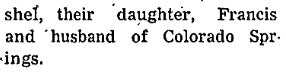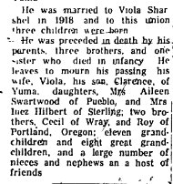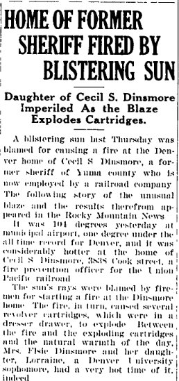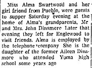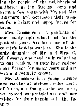 1919 Wray "Mrs. C.M. Sweazy returned Saturday evening from a three weeks visit with her daughter, Mrs. C.S. Dinsmore, south of Yuma."