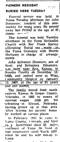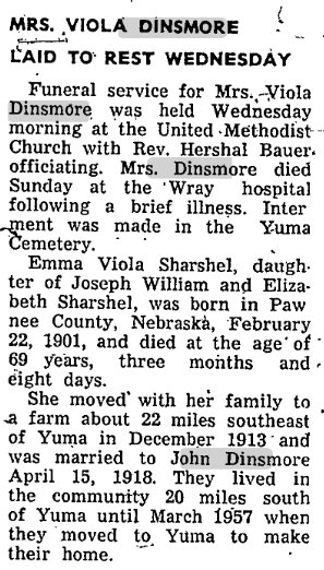 His wife was Emma Viola Sharshel (1901-1970). Death Notice- "Wray Gazette", Wray, Yuma Co., Colorado, Jan. 19, 1967. He was a s/o Scott Dinsmore (1846-1923) and Belvadora (Slusher) Dinsmore (1852-1945). John Dinsmore and wife Emma Viola on same tombstone.