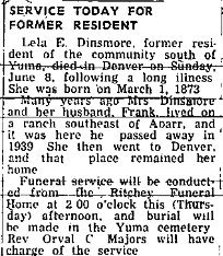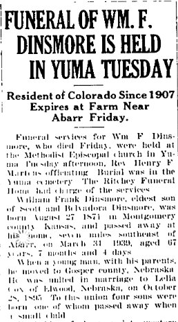 William - August 27, 1871 - 1939 is buried in the Yuma cemetery 48944650 with spouse Lela E. (Cox) Dinsmore 1873-1952