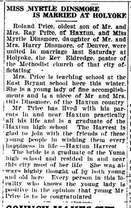 Haxtun News March 17, 1921 "Mrs. Earl Dinsmore, who is under medical care at the Haxtun sanitarium, is reported to be recovering rapidly."
