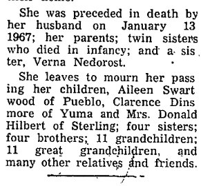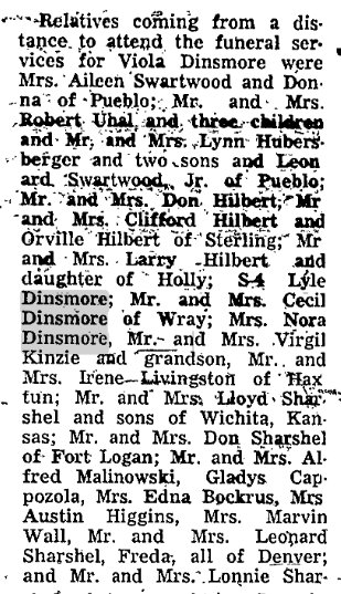 Haxtun Harvest, Haxtun, Colorado, Wednesday, March 21, 1945 DEATH COMES QUIETLY TO AGED MOTHER Grandma Dinsmore Passed Away at Home of Son Mrs. Belvadora Dinsmore, 92, died in Haxtun Monday morning, March 19, at 9:20 o’clock. Mrs. Dinsmore made her home in Haxtun with her son, Ottis Dinsmore, and Mrs. Dinsmore, and it was at their home that she passed away. Death came to her peacefully after a very short illness. Mrs. Dinsmore had been a resident of Colorado for 35 years. She was born February 8, 1853, in the state of Missouri, daughter of William Slusher and Katherine Taylor Slusher. Services were held at the Brethren church in Haxtun Thursday afternoon at 1:30 o’clock, with Rev. Otto Laursen, pastor of the church in charge. Pallbearers were Messrs. A.C. Heaston, H.E. Stryker, J.A. Sand, Louis A. Koch, Leonard Fetzer and E.L. Ramsay. Interment was in the Haxtun cemetery with the Radford Funeral home in charge. The obituary read at the services follows: Belvadora Slusher, oldest daughter of William and Catherine Slusher was born in Harrison County, Missouri on February 8, 1853, and passed away at Haxtun, Colorado, March 19, 1945, age 92 years, one month and 11 days. She was married to Scott Dinsmore on July 10, 1870 in Montgomery County, Kansas. To this union were born six sons and one daughter. The daughter passed away when a small child. The family lived in eastern Kansas until 1892 when they moved to Gosper County, Nebraska. While in Nebraska they both united with the Methodist church. Going from Nebraska to western Kansas and came to Haxtun, Colorado in 1910. In the spring of 1912 they moved to Yuma County, taking up a homestead about 25 miles southeast of Yuma, making their home in Yuma County until her husband passed away on October 16, 1923. She came to Haxtun after her husband’s death to make her home with her son, Ottis. Her oldest son, Frank passed away in April 1939. She leaves to mourn her passing, one sister, Mrs. Cinda Shestad, Independence, Kansas, five sons, Harry of Loveland, Colorado, Ottis of Haxtun, Colorado, John of Yuma, Colorado and Cecil of Denver, twenty-six grandchildren, thirty-six great grandchildren and two great, great grandchildren. Haxtun Harvest, Haxtun, Colorado, Wednesday, March 28, 1945 CARD OF THANKS Words cannot express our appreciation for the kindness and sympathy shown us by our neighbors and friends of the Haxtun community during the sickness and burial of our Mother and Grandmother. Also the beautiful floral offerings. Harry Dinsmore and Family, Ottis Dinsmore and Family, Roy Dinsmore and Family, John Dinsmore and Family, Cecil Dinsmore and Family.