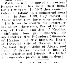 ***** Haxtun Harvest, October 19, 1960, Haxtun, Colorado ***** Last rites for Ottis Dinsmore, a retired farmer and pioneer of this community, were held Saturday afternoon at 2:00 p.m. o'clock from the Church of the Brethren with Rev. Virgil Weimer in charge. Organist was Mrs. Weimer and a quartet composed of Mr. and Mrs. Wilbur Kipp and Mr. and Mrs. Marvin Switzer sang, Whispering Hope, Lead Kindly Light, and The Old Rugged Cross. Honorary escorts were Ray Nimmo, A.C. Heaston, Willis Barden, Andy Russell, Frank Smith and Fred Reyher, and acting escorts were Fred Heaston, Merle Switzer, Willard Harte, Ernie Stryker, Eldred Atkins and Wallace Burton. Ushers were Raymond Baker and August Krehmeyer. Concluding service and burial was at the Haxtun cemetery. The following obituary was read: Ottis Dinsmore was born September 14, 1875 at Joplin, Missouri, the son of Scott and Belbadore Dinsmore. In the early years of his life the family moved to Kansas and later to Elwood, Nebraska. On March 18, 1900, Brother Dinsmore was united in marriage to Nora Chase of Elwood, Nebraska. Immediately following their marriage the couple moved to a farm at Rexford, Kansas. To this union were born four children, one son who died in infancy, three daughters, Catherine, Irene and Erma. Before coming to Colorado, Brother Dinsmore made a trip to Haxtun to look for a location and was staying at the hotel in town when Haxtun became incorporated. In 1909 the family moved to a farm northwest of Haxtun. In March of this year, Brother and Sister Dinsmore celebrated their 60th wedding anniversary. Brother Dinsmore was a farmer at heart. He enjoyed gardening and fishing. After leaving the farm in 1942 these interests became a source of fruitful activity. He was a man who was interested in his fellowmen. A neighbor reminisced that from the time of my childhood I always knew Brother Dinsmore as a happy person. He also possessed a delightful and stimulating sense of humor. Brother Dinsmore has been an active member of the Church of the Brethren for 36 years. On the morning of Tuesday, October 11, 1960, while en route to Jumbo reservoir for a day of fishing with his wife and neighbors, Brother Dinsmore died suddenly in the car on route 59 just south of Highway 30, at the age of 85 years and 26 days. Surviving to mourn his passing are his wife, Nora Dinsmore; three daughters, Catherine Kinzie and Irene Livingston of Haxtun, and Erma Shoemaker of Bend, Oregon; three brothers, Roy of Portland, Oregon, John of Yuma, Colorado and Cecil of Vernon, Colorado; three sons-in-law, Virgil and Ernest Livingston of Haxtun and Phil Shoemaker of Bend Oregon; ten grandchildren, five great grandchildren, many nephews and nieces, as well as many friends and neighbors. 58925001 ROY In 1900 Gosper County, Nebraska "Claude" October 1878 and Mary B. May 1882 have been married two years. She's had one child, none living. In 1910 Haxtun Roy C. Densmore is 32, a cement worker born in Missouri, Mary B. 27, Herbert R. 9, and Henry S. 7, all three born in Nebraska. In 1920 Paoli "Claude" and Mary have Herbert, Henry, Vera 9, Jada 5, and Mary 1. He's a merchant.