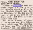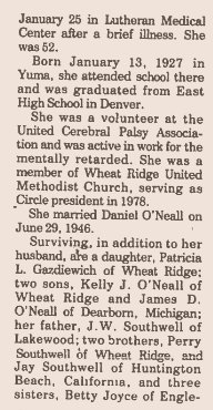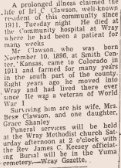 May 14, 1981 "Funeral services for John Wesley Southwell, former Yuma resident, were held Monday at wheat Ridge. Those attending from Yuma were Marvina nd Bettie Van Horn, Dale Van Horn, and Lizzie Van Horn. A sister-in-law of John's, Mrs. Bess Clawsen was unable to attend from Boulder due to illness. She is a former Wray resident."