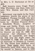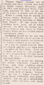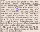 1933 "Mr. and Mrs. Irl Clawson drove to Omaha, Nebraska Sunday to join the J.W. Southwell family at the home of of Mr. and Mrs. John Bell ain order that the entire family might spend Christmas together. Besides the ones mentione above, Mrs. Clawson's parents, Mr. and Mrs. J.G. Cornell, and her brother, Edgar Cornell and his wife were present. The Southwell family visited Mr. Southwell's sister at McCook, Nebaska a few days befoe going on to Omaha.