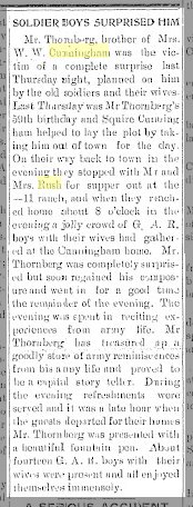 1913 "Ota Tosh returned home from his visit in Denver Friday evening. Mrs. Tosh and niece, Little Miss Minona Belle Cunningham, will remain until the last of this week with the Otto Rush family and the Misses Minnie and Blanche Cunningham of that city"