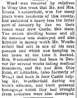 1912 Ernest Weatherfield was a Wray visitor Saturday, from his ranch northwest. He was aconpanied by his sister-in-law, Mrs. Gertrude Courtney, from her claim near the Weatherfield ranh.