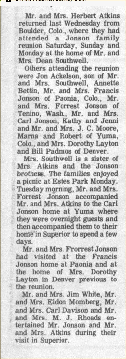 Evergreen Cemetery. Atkins, the daughter of Frank and Rose Suey Jonson, was born Jan. 5, 1908 on a farm in Nuckolls County Neb. She was a member of the First United Presbyterian Church, the Rebekah Lodge, 35 year member of the Hospital Auxiliary, all of Superior, and The Volunteer Red Cross. Survivors include her husband, Charles Herbert Atkins, Superior; brothers, Francis Jonson, Canon City, Colo., and Forest Jonson, Olympia, Wash.; and a sister, Ida Southwell, Denver JULY 1972 Superior, Nebraska