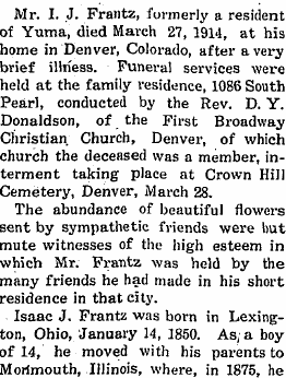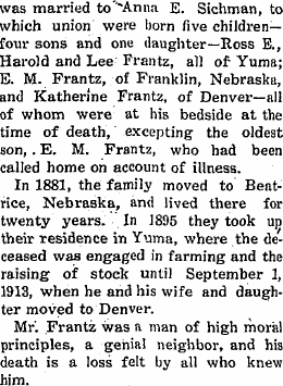 1911 "Born Monday, September 18, to Mr. and Mrs. Harold Frantz, of Eckley, at the home of Mr. and Mrs. I.J. Frantz in this city (Yuma) a baby boy. Mother and son doing nicely, and Dr. Crawford says he thinks Grandpa Frantz will pull through all right."