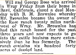 .One tree has William L. 1865 the son of George and Loretta J. Rose, In 1910 West Wray George, 48 Wisconsin, and brother William L. 45, Iowa, are living together on the Eckley Road.