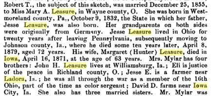In 1900 Franklin County, Nebraska, Myron Leasure, born March 1891 in Iowa, is with parents Alfred and Nellie Leasure.