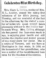 Leaving four children, 14 grandchildren, and 22 great-grandchildren, of 94 years last Friday, at the home of her son, Harvey Collins, 50 W. lO8th st. Mrs. Collins, who was born in Huntington, Vermont, March 16, 1834, came to the middle-west with her husband and four children in 1869, locating in New London, Iowa, and moved to Chicago in 1885. With the exception of a period of months each year from 1903 to 1909, spent in proving a claim near Wray, Colorado, her residence in Chicago has been continuous.