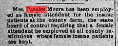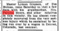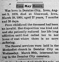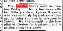 Paralee's sister died in 1907 "MRS. SARILDA STANLEY was born in Bainbridge, Putnam County, Indiana, March 8, 1839, and departed this life Dec. 26, 1906, aged 67 years, 9 months and 18 days. Her maiden name was HUFF. She grew to womanhood at the place of her birth, and in 1861 was united in marriage to J. HANKS. To this union one child was born, now MRS. IDA MAY FISHER, residing in Decatur City. In 1864, she, with her child and father's family, came to Wapello County, and to this county a year later. In October, 1868, she was married again this time to DANIEL STANLEY. To them were born three sons and three daughters, four of whom are living. They are FRANK, who resides with his mother; MRS. DAISY MCCUTCHAN; and MRS. MATT PULLEN, all of Leon, Iowa; and ED, of Columbia, Nebraska. Besides these there remain to mourn her departure, one brother and five sisters; JOHN HUFF and MRS. JULIA VAN HINING, of Kansas City, Mo.; MRS. NANNIE DICKINSON and MYRTILLO RUMLEY, of Fort Collins, Colo.; and MRS. ELLEN BECK and MRS. PARALEE MOORE, of Leon, Iowa. Two children, ALVIN and DOLLY, and her husband, who departed this life April l3, l90l, have preceded her to the spirit world. Her passing away was peaceful and with hope for the wondrous future. When asked as to the future, she expressed herself as not afraid to go. |