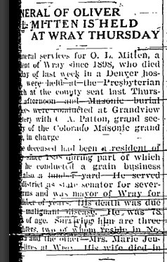 July 17, 1908 "Announcements were received by friends in Wray yesterday that O. L. Mitten,