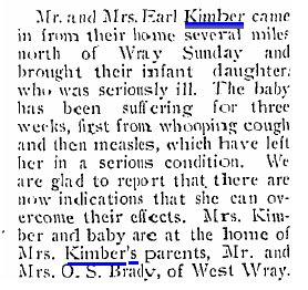 Johnson County Nebraska "Mrs. Walbridge's sister, Mrs. Kimber of Wray, Colorado, who came two weeks ago, is still here. " Susan Eliza McKee1 was born on 16 Jan 1850 at Decatur, Indiana.2 She was married to Philo Walbridge, son of James WALBRIDGE and Sophia Unknown, on 1 Sep 1868 at Cedar, Iowa by J. W. Knot, M.G.. Philo is listed as Philip in the marriage index.3,4 She and Philo Walbridge appeared on the census of 7 Jul 1870 at Mechnicsville, P.O., Pioneer, Cedar, Iowa; Philo, 24, farmer, real estate=$1680, personal estate=$765; Eliza, 19, keeping house. At home was Winnifred, 1.5 She and Philo Walbridge removed to a farm south of Crab Orchard, Johnson, Nebraska, in 1880.6 They appeared on the census of 9 Jun 1880 at Vesta, Johnson, Nebraska; Philo, 35, farmer, born Iowa, mother born Vermont; Eliza, 30, keeping house, born Indiana, father born Kentucky, mother Virginia. At home were: Fred, 11; Earnest, 9; Blanch, 8; Mabelle, 6; Ray, 2.7 In 1881 their five children died in a diptheria epidemic. Ray, 3, on May 28; Mable, 7, on June 1; Ernest, 10, on June 2; Winnifred, 12, on June 5; and Blanche, 9, on June 11. They are buried in Crab Orchard Cemetery.8 She and Philo Walbridge appeared on the census of 1900 at Main Street, Crab Orchard, Johnson, Nebraska; Philo, 56, born January 1844, married 32 years, landlord, rented house, born Iowa, father born New York, mother Vermont; Eliza S., wife, 50, born January 1850, 10 births, 4 children living, born Indiana, father born Kentucky, mother Indiana. At home were: Faith E., 18, born ? 1881, Nebraska; Grace, 16, born ? 1883, Nebraska, Mamie, 15, born Feb 1885, Nebraska, Isabella, 10, born Nov 1889, Nebraska. Enumerated with the family were John D. McKee, grandfather, 78, widower, born Dec 1821 Kentucky, parents born Kentucky, and three boarders.9 She and Philo Walbridge removed to Sansarc, Stanley, South Dakota, in 1908.10 They appeared on the census of 1910 at Township 6 North, Range 26 EBHM, Stanley, South Dakota; Philo, 65, butcher, owned meat market, owned farm #132; Susan, 61, nurse, employed as physician's assistant, 10 births, 4 children living. They were married 42 years.11 In 1915 they returned to Crab orchard. She and Philo Walbridge appeared on the census of 8 Jan 1920 at Canfield Street, Crab Orchard, Western Twp.,, Johnson, Nebraska; Philo, 74, butcher, owned own shop, owned hous free; Elizabeth S., 69, born Indiana, father born Kentucky, mother born Pennsylvania.12 She died on 19 Dec 1928 at home of her daughter, Mrs. H. A. Welsch, Crab Orchard, Johnson, Nebraska, at age 78; She was aged 78 years, 11 months and 3 days.13 "Mrs. Walbridge was a life-long member of the Methodist church. She was a woman of fine Christian character, a loving wife and mother, and a true friend. Funeral services were held at the home Friday afternoon at one o'clock and were conducted by Rev. R. J. Mohlzahn."14 She was buried on 21 Dec 1928 at Crab Orchard Cemetery, Crab Orchard, Johnson, Nebraska.15 |