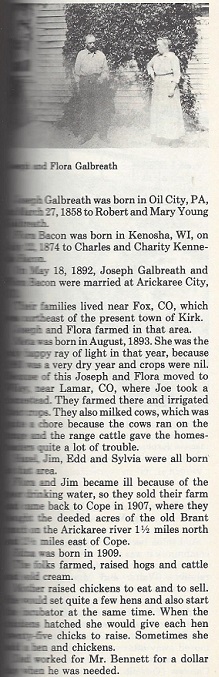 In 1900 Prowers County Joseph Galbreath, Mar 1860 Pennsylvania, no occupation, is married to Clara/Flora M. Feb 1876 Wisconsin, with Neeta May 1893, Hazel Apr 1897,and Lavier Feb 1900, all three kids born in Colorado.