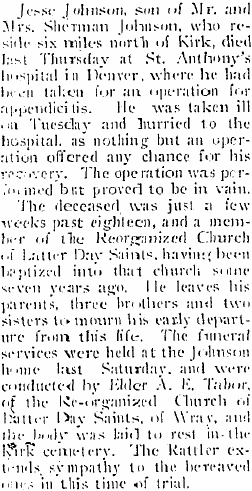 The Kirk cemetery records have Jesse Johnson born Dec 7, 1898 dying March 23, 1916 - the ony Johnson they have listed.