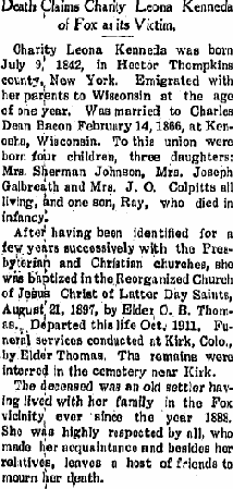 December 1911 "Mrs. Flora Galbreath, administratrix of the Charity L. Bacon estate, accompanied by her husband was in town Monday settling up the estate. They live soutwest (sic) of Yuma." The legal notices said Flora M. Galbreath, Lottie M. Johnson, and Nora L. Colpitts were heirs.