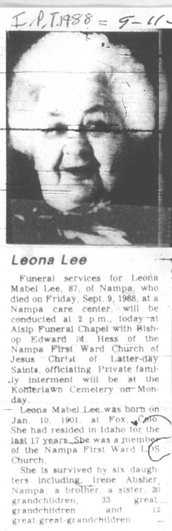 Grace Irene Absher - Jan 31, 1920 - May 2, 2005 - 66190253- and Bert O. Absher 1918-1983 are buried in Nampa.