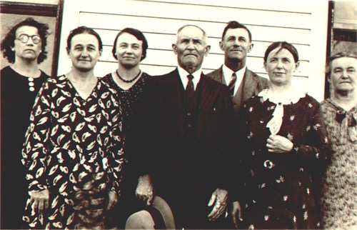 Jacob Benke, Father, in middle. Left to right: Marie (married Abraham Dalke), Elizabeth (Married John Sawatzky), Anna C (married Cornelius Voth), Jacob Benke (son), Tena (married Isaac Kroeker), Agnes (married Toews)