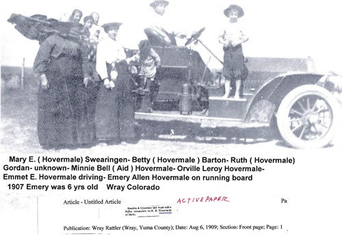 When EMMETT ELMER HOVERMALE passed away at his home in our city January 17 ,one of prominent real estate men and citizens took his departure into the spirit land. For many years Mr. HOVERMALE was a familiar figure in boosting our western country. His going was unexpected and is with sorrow and regret to his friends who join us in extending sympathy to the bereaved relatives. He was born in MORGAN County ,WEST VIRGINIA , 25 SEPTEMBER 1879,and died in WRAY COLORADO, JANUARY 17 1917, age 37 years 3 months and 22 days. He came to COLORADO with his parents in JULY 1888 and has grown to manhood here. DECEMBER 23 1900 he was married to MISS MINNIE B. AID. They lived on a farm near IDALIA until 1908 when they moved to WRAY where he has been engaged in the real estate business since.