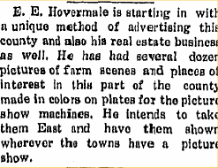 1907 Vernon "E.E. Hovermale, from the South Divide, came into town a-flying Wednesday. His little girl had a grain of corn in her nose, which Dr. Ewing removed."