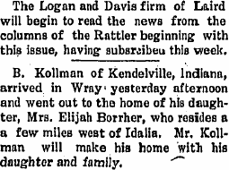 1906 "Elijah Bohrer, who went to Indiana from this county about a year ago, returned Tuesday to this place. Mr. Bohrer thinks better of Yuma county now than when he left and comes back with the intention of remaining here and again becoming a citizen of Colorado."