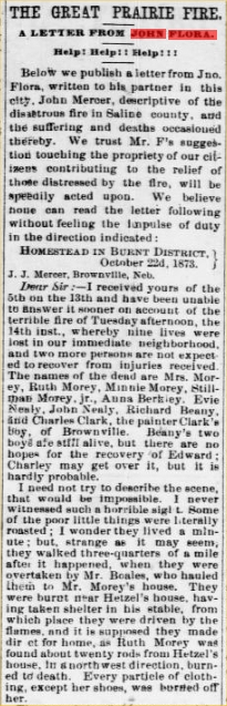 "In 1873 a woman and four school children burned to death in Brush Creek