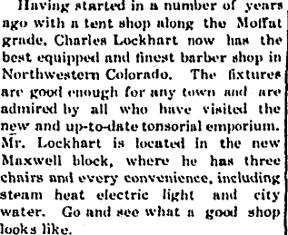 In 1910 Routt County, Colorado Charles D. "Lockhart" is a barber. He and Mollie have Fay D., a fireman on the railroad, Fern M. and Aileen C.