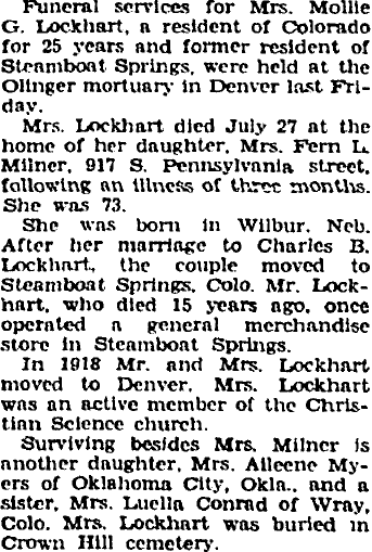 Charles D. Lockhart -1862-1923 and Mollie G. Lockhart 1865-1938 are buried in Crown Hill, Wheat Ridge, per FindAGrave. 35387492 and Mollie 35387539