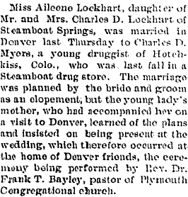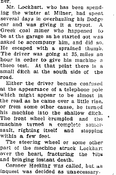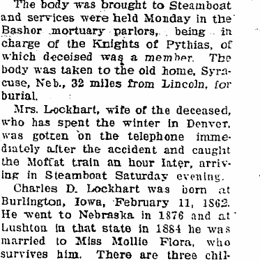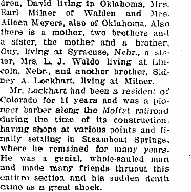 1919 "Charles D. Lockhart, who for two months had been at Wray, was on Sunday night's train, returning to Milner, where he will spend the summer."