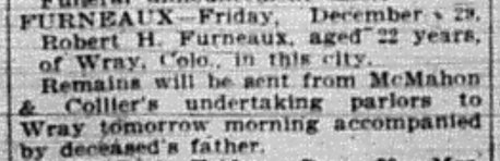 1899 Wray "F. H. Ferneaux of Fox, deputy assessor of Arapahoe county, was in Wray Wednesday.