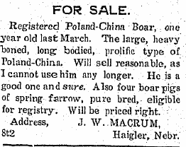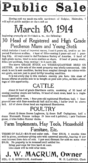 1904 Haigler "J.W. Macrum received a car load of steers from Western Colorado Friday morning."