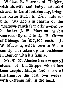In 1909 Haigler "Wallace Macrum spent Sunday at Wray visiting friends" and "Mr. and Mrs. Rosenkrans, of New York, and Miss Lura Johnson, of Wray, were visiting at the Macrum ranch the first of the week."