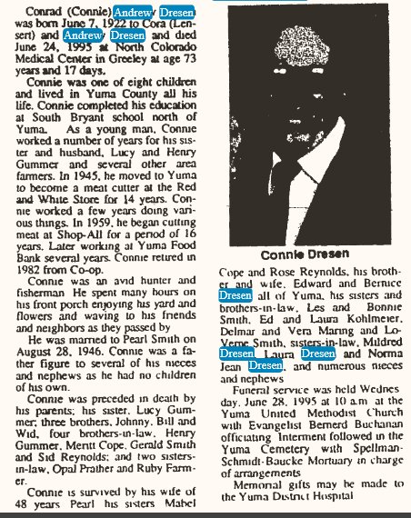 Conrad Andrew Dresen is buried in Yuma 1922-1995, # 48944672.