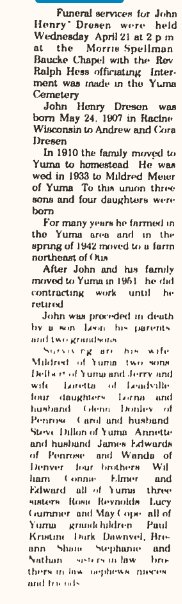 Edward Roy Dresen, Sr. 1916-2000 is buried in Yuma # 48944675, with Bernice A. (Chesney( Dresen 1921-1998.