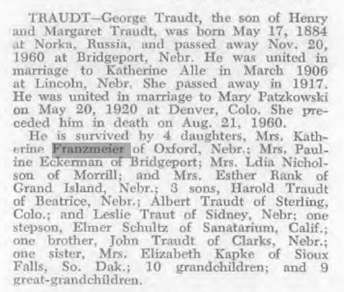Kathryn (Traudt) Franzmeier 1906-1981 is also buried in Grand Island.