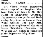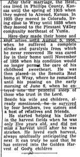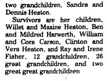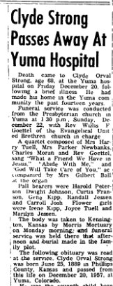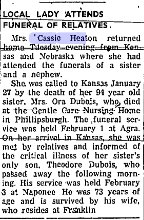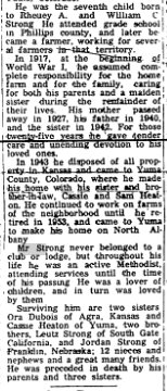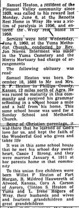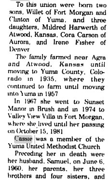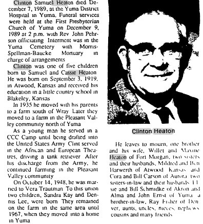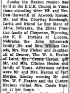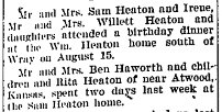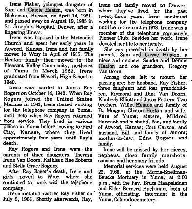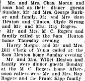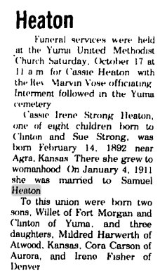 Anna and John F. Strong were the parents of William C. Strong born about 1852 in Indiana. He was the father of Cassie, who married Sam Heaton. William's sister was Anna, born about 1869, mother of Ray. So Cassie Heaton of Pleasant Valley, Yuma County, was the aunt of the Morgan brothers. In 1900 Phillips County, Kansas, William Strong born Jan 1852 in Indiana, married 27 years to Rheney Jan 1852 Ohio ,have Stella G. March 1880 Loutze C. April 1882, Cora M. Dec 1884, Jordan F. April 1887, Clyde O. June 1889, and Cassie I. Feb 1892, all kids born in Kansas | Cassie married Samuel Heaton, and in 1910 they're in Rawlins County, Kansas, Sam 31, Cassie 29, Willet 8, Mildred 6, Cora 2, and Clinton five months.
