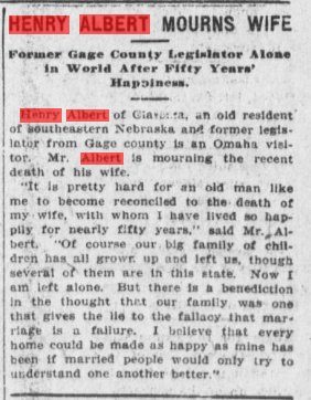 A 1904 newspaper article mentions "Henry Albert, former member of the legislature from Gage county.". In 1908 Effie J. ALbert, daughter of Mr. and Mrs. Henry Albert, married Francis J. Chittenden. Henry Albert and J. H. Steinmeyer, both highly esteemed pioneer residents of Gage county, were the proprietors of Clatonia, and having caused the townsite to be surveyed and platted in the spring of 1892, they filed the plat for record in the office of the register of deeds, December 3. 1893. In 1894 Henry and William Steinmeyer built a bank and the following year Henry Albert started one across the street. Henry Albert came from Germany in the early days and was a pioneer of