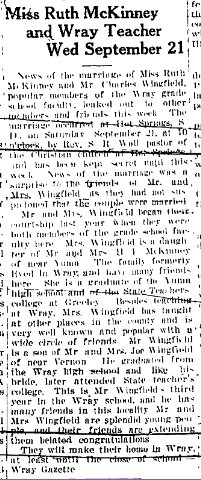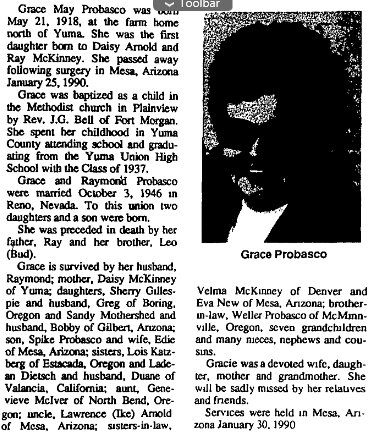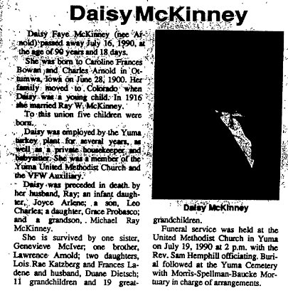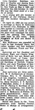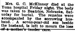 Bee Darwin was born at Virginia, Neb., Feb. 29, 1894, was married to O. C. McKinney, Mar 9, 1912. The first five years of their lives were spent in Beatrice and here their son Kenneth was born. From there they they moved to Yuma, Colo., where she died Feb. 12, 1920. She was a victim of the flu and being critically ill was taken to the hospital and after a time was so much improved it was planned to take her to her home but the night before when all was ready for her return the next day, the end came suddenly and unexpectedly, the cause heart failure. Her age was 25 years, ll months and 12 days. She grew to womanhood here, attended school here and was brought back to her childhood home and laid to rest by the side of her parents in the Filley cemetery. She leaves four brothers and one sister: Allen, Harvey and Clifford of Virginia, Verne of Sioux City, Iowa and Mrs. May Ramsey of Fowler,Colo. The pallbearers were her old schoolmates: Fred Butterfield, Joe, John and George Weber, Walter Erickson and Jerry Kozak. Beatrice, Nebraska Daily Sun April 4, 1920 Bea is buried in Gage County # 59312626. |