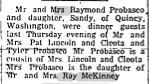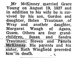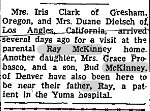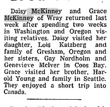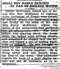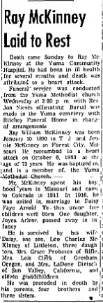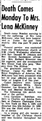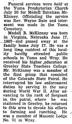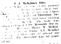 July 21, 1927 "C.J. McKinney, who had been visiting with his father T. J. McKinney and other relatives north of Yuma for a couple of weeks, left Saturday, bound for his home at Casper, Wyoming." Funeral services were held in Forest City, Tuesday, Dec. 13, for Thomas J. McKinney, 82 years old, who died Thursday, Dec. 8, 1927, in Fowler, Colo. Services were held at the Methodist church, conducted by Rev. J. Harold Fairly and burial was in the Forest City cemetery. Mr. McKinney, who was born at Stanford, Ky., Jan. 22, 1845, was a resident of Forest township for a number of years but left this vicinity several years ago. He leaves a daughter, Mrs. Daisy Bagby living hear Mound City.