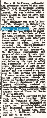 Thomas is buried in Holt County, # 94277257, with Mary J. 1863-1893. In October 1928, Ray McKinney was the administrator of Thomas J. McKinney's estate to be settled in Yuma County Court. |