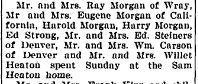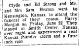 Anna and John F. Strong were the parents of William C. Strong born about 1852 in Indiana. He was the father of Cassie, who married Sam Heaton. William's sister was Anna, born about 1869, mother of Ray. So Cassie Heaton of Pleasant Valley, Yuma County, was the aunt of the Morgan brothers. In 1900 Phillips County, Kansas, William Strong born Jan 1852 in Indiana, married 27 years to Rheney Jan 1852 Ohio ,have Stella G. March 188 Loutze C. April 1882, Cora M. Dec 1884, Jordan F. April 1887, Clyde O. June 1889, and Cassie I. Feb 1892, all kids born in Kansas | Cassie married Samuel Heaton, and in 1910 they're in Rawlins County, Kansas, Sam 31, Cassie 29, Willet 8, Mildred 6, Cora 2, and Clinton five months.