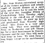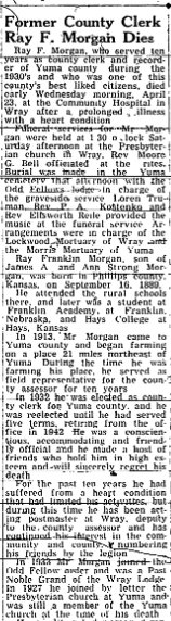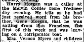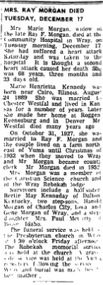 Haxtun Herald, Haxtun, Colorado, July 12, 1995 Eugene Raymond Morgan, age 79, of Haxtun, died Thursday, July 6, 1995, in Greeley. Mr. Morgan was born in Kensington, Kansas on September 15, 1915, to Roy Franklin Morgan and Mary Sara (Allen) Morgan. When he was a child, the family moved two miles south of Clarkville, where his father homesteaded. The family later moved to Wray. Mr. Morgan attended grade school at Pleasant Hill School on the Correction Line in Yuma County. He graduated in 1934 from Waverly High School in that same area. In 1937 Mr. Morgan joined the U.S. Navy and served until receiving a medical discharge. He worked in the sale barn at Wray. He then farmed for Jack Hutt, first at Wray and then at Dailey, an occupation he continued until his retirement. Mr. Morgan then moved to Haxtun where he lived until his death. In Haxtun he served on the Town Board and the Haxtun Housing Authority. He was a Brethren Church Moderator and Deacon. Mr. Morgan was a member of the American Legion and the V.F.W. He is survived by a stepson, John H. Hewins, and was preceded in death by his first wife, Margaret; his second wife, Verona; a brother, Harold; and a sister, Ardell. Services for Mr. Morgan, whose body was cremated, will be Thursday, July 13, at 10:30 a.m. at the Church of the Brethren in Haxtun. Inurnment will be at the Haxtun Cemetery. |