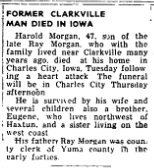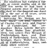 James Henry Morgan, son of James and Anna Strong Morgan, was born June 13, 1896, near Kensington, Kans. It was here he grew to manhood, having received his education in the local schools and found great interest and happiness in the life of a farmer. He was a veteran of World War I. After this he located at Yuma, Colo., where he remained until poor health caused him to go to Iowa to make his home with his brothers and sisters. He was a quiet, home-loving disposition, forming many close friendships throughout his lifetime. Very notable was his friendship with children and they gave him many hours of pleasure until his sickness advanced to where he could only listen for their voices at play and watch them from his window. He will be greatly missed by these friends. He has been a patient sufferer for the past six years and every effort possible was made that he might retain his health but to no avail, and he was comforted by thoughts of the home where all suffering ends. He passed away June 19, 1956, at the age of 60 years and 6 days. He was preceded in death by his father, mother, two sisters and three brothers. He is survived by two sisters, Mrs. Jack Smith of Parkersburg, Ia., Mrs. Clifford Morgan; also two brothers, Walter and Dee Morgan, all of Fredericksburg, Ia. James # 116558228 is buried in Kensington. |