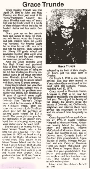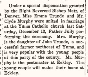 May 10, 1912 Yuma "A baby girl was born to Mr. and Mrs. John Trunde, north of