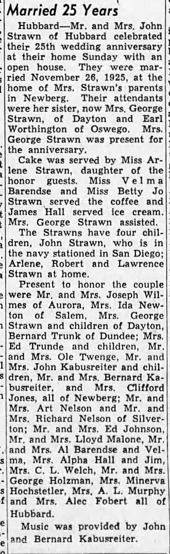 Mr. Strawn was born Jan. 31, 1929, in Newberg to John and Mabel (Trunde) Strawn.