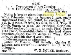 September 1910 " Sam Arnold's mother of McCook has filed land near him