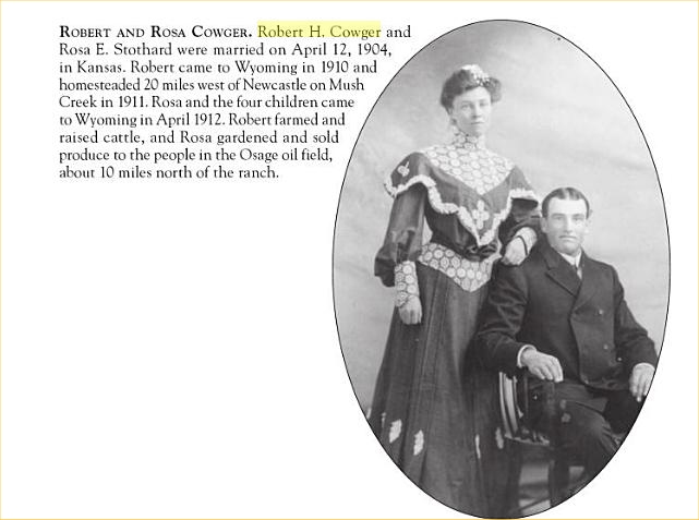 Robert Henry Cowger registered for WWI in Newcastle, Wyoming, saying he was born Jan 11, 1880, and was married to Rosana Elisabeth Cowger.