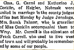 April 1904 "Wedding bells were ringing Tuesday nearly all day. Robert Cowger was the young man from Haigler and the young lady was from near Jaqua. We have not learned her name but will give it when the cards are out."